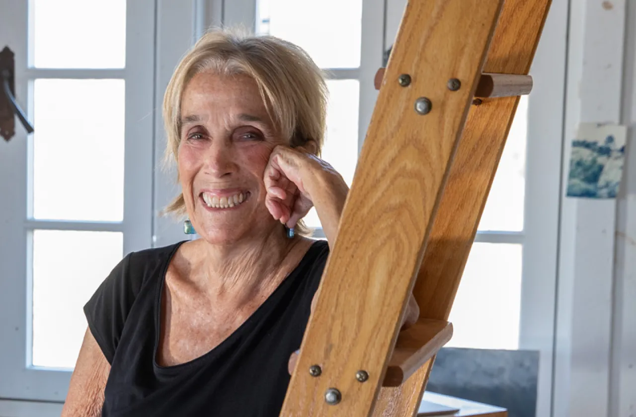Barefoot Anne Peretz in her studio, surrounded by paintings and easels