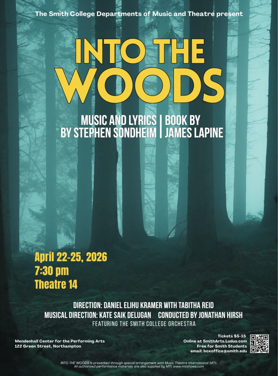The Smith production pulls the story out of the realm of fantasy and places it in a real forest with a group of young friends camping together and creating their own magical experience. The ensemble cast of 20 portray classic storybook characters—Little Red Riding Hood, Jack and his magic beans, a witch, Cinderella, the Wolf, some princes, and Rapunzel—with help from costumes designed to switch between normal life and fairytale by Kiki Smith, professor of theatre. Set designer Alina Tschumakow ’26 has created a forest that alternates between reality and fantasy, lighting designer Via Sussman ’26 transforms the realistic set into a magical inner landscape with the support of sound design by Reed Shaw ’27 and faculty member, Lara Dubin. This show is recommended for 13+ due to length and dark themes. Full content details and tickets ($5–15) at smitharts.ludus.com.