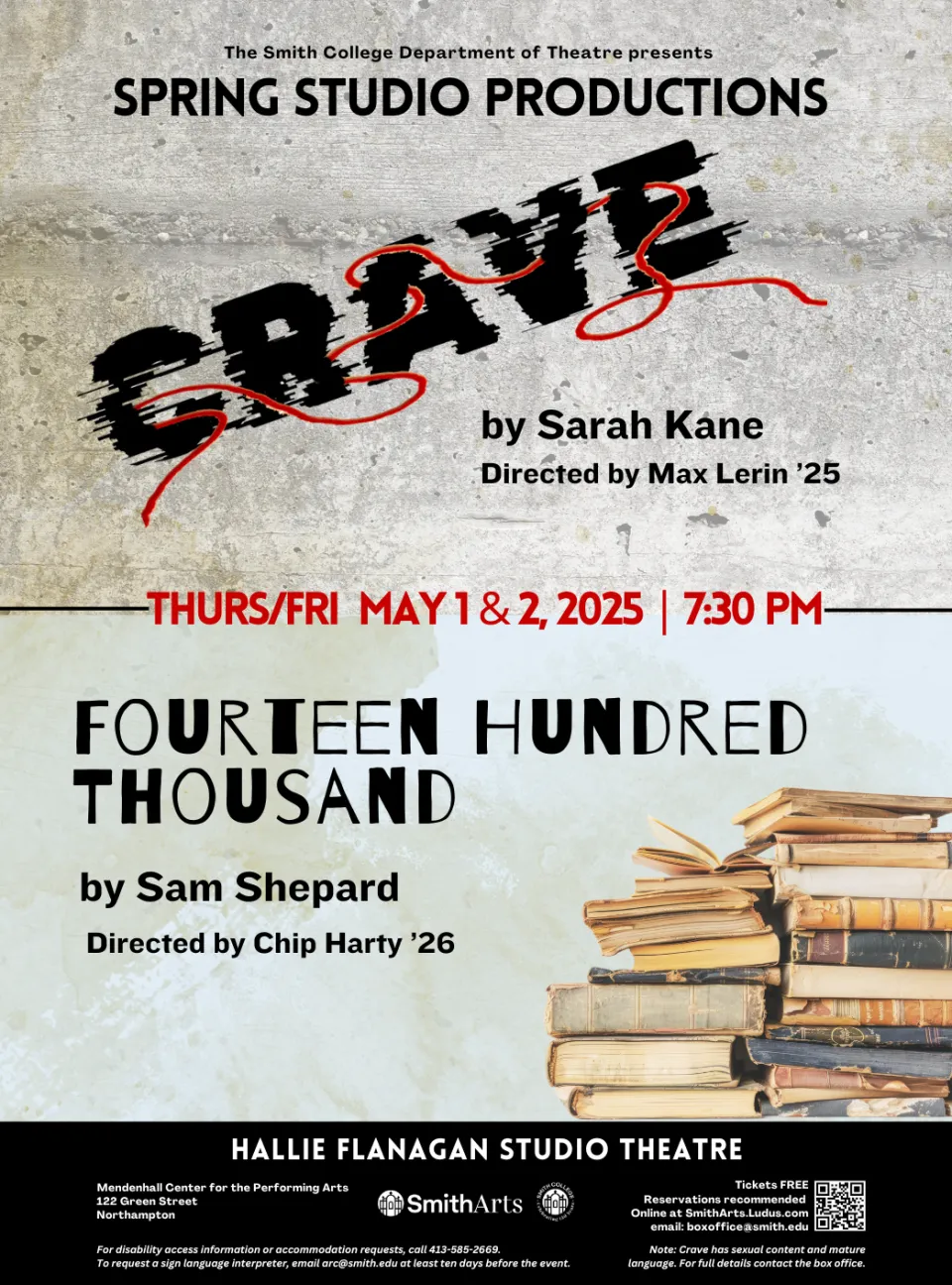 The Smith College Department of Theatre presents an evening of student directed one-act plays on May 1 and 2 at 7:30 p.m. in Hallie Flanagan Studio Theatre in Mendenhall Center for the Performing Arts. The 2025 Spring Studio Productions include Fourteen Hundred Thousand by Sam Shepard, directed by Chip Harty ’26 and Crave by Sarah Kane, directed by Max Lerin ’25. Tickets are free at smitharts.ludus.com.