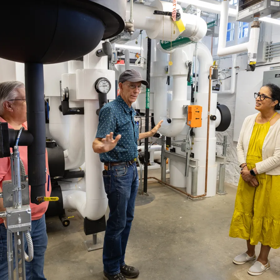 Gary Hartwell (center), project manager in Facilities Management, explains the workings of the new North District geothermal energy station to visitors from Hadley Public Schools. Part of Smith’s groundbreaking geothermal energy project, the station is now sending low-carbon heat to campus buildings on the north side of Elm Street.