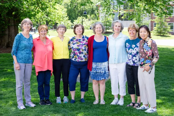 Eight members of the Class of 1973 Tapestry Giving Circle came to campus for their 50th Reunion in 2023, from left: Ellen Reath, GiGi Benjamin, Robbie Lipsman, Sue Cohn, Lindsey Lang, Sherry Dickstein, Laurie Woodard, and Gloria Eng. (Not present: Laurel Davis Huber, Margie Stetson, and Lisa Westerback.) Photograph by Lindsey McGrath