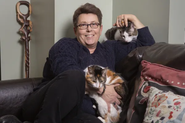 With two cats of her own—not to mention a dog, three goats, and four ducks—Kris Erickson AC ’99 couldn’t adopt her late mother’s five felines. So, she turned to social media for help. | Photograph by Peter Ross.