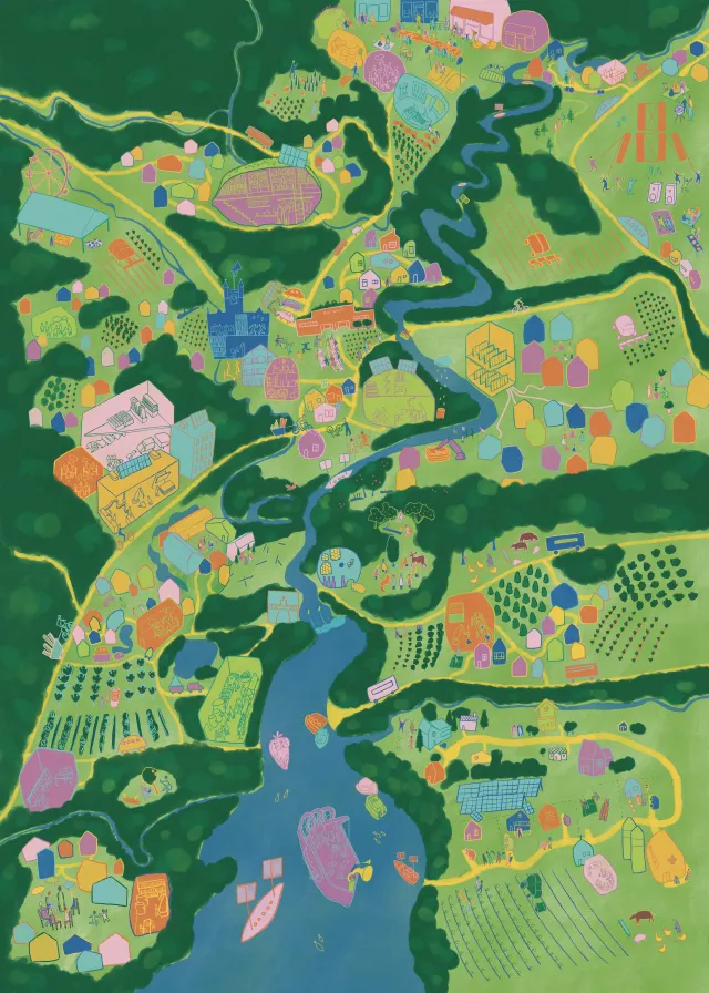 Gerber notes that some collaborators have spoken about the luxury of taking time to envision the future; many participants are so busy doing their day-to-day work that they have little time to dream. The workshops Gerber offered allowed them time to think and envision collaboratively. Gerber and her students asked participants about their work, their location and what kind of world they’re hoping to build through their efforts. Then, the participants worked in pairs to choose one priority about the world they were building, and “imagine a future one hundred years beyond the fall of capitalism, where this value is the most important prioritized thing, and all the social systems in this place are based on that.” The pairs responded to prompts such as, “If there is no private property ownership, how do people access land to live on?” And, “If there are no bosses or working for a wage, how is labor organized to produce what we need? Who does what?” Then, based on their ideas, participants drew scenes showing what living in this future might look like. After the workshops, Gerber and her students synthesized the drawings and ideas into the final map where the different groups’ visions exist side-by-side. Gerber points out that in these imagined scenarios, “people are still people and physics is still physics . . . But the thing that changes is the way that we organize our social systems. What impacts does that have both positive and negative? And how can we explore that through imagining this future?”