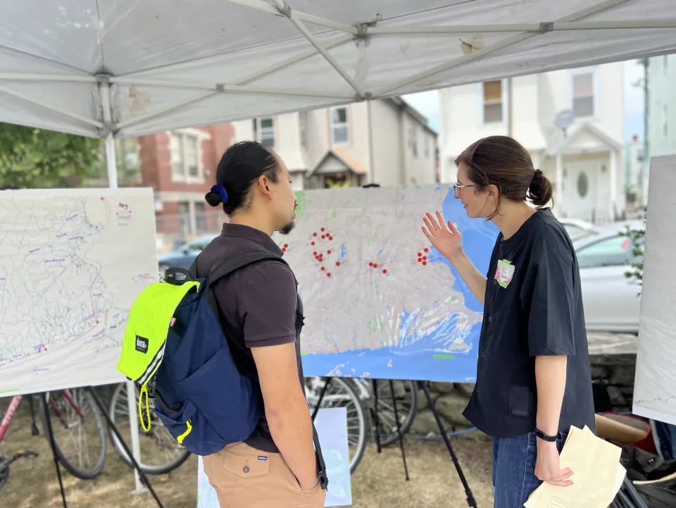 Gerber also asked Smith faculty and staff with expertise on climate science and river landscapes (Greg de Wet from Geosciences, Reid Bertone-Johnson from Landscape Studies, and Heather Rosenfeld and Kala’i Ellis from the Spatial Analysis Laboratory) to consider what the valley might look like if, say, there were fewer dams in the Connecticut River. What would be the impact on the valley from a wilder, more tumultuous river as well as from rising sea levels? Gerber did not want mapping this particular future to “terrify people,” but she and her students have incorporated potential impacts from climate change into the map, though not the most extreme versions that showed the mountains of the Holyoke Range becoming a series of islands in a rising sea.