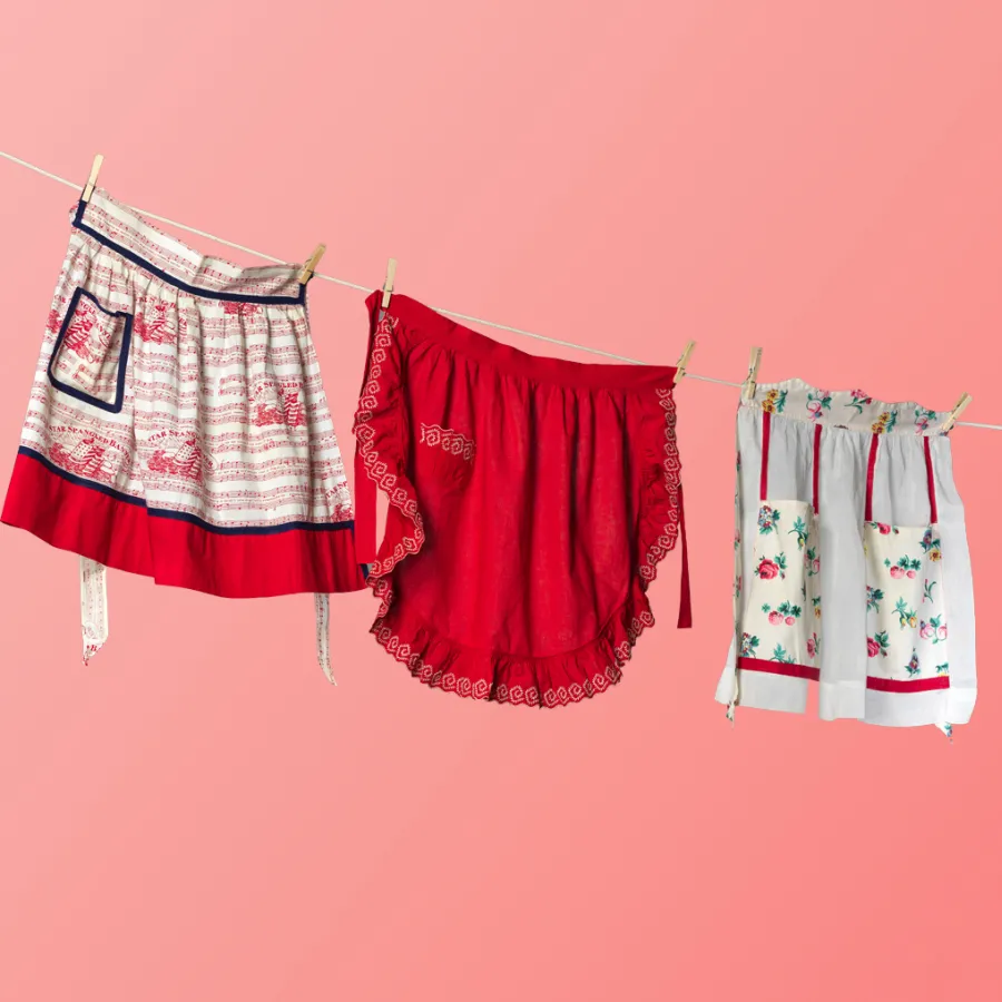 Aprons were a routine artifact of women’s culture in the ’50s and ’60s. Homemaking and being a good hostess were very important. Aprons were useful for keeping flour off your clothing when baking and provided an opportunity for self-expression. They weren’t strictly white utilitarian aprons. When I took my first sewing class in grammar school, one of the first projects was making an apron. Even the most everyday items can be outlets for women’s creative expression.