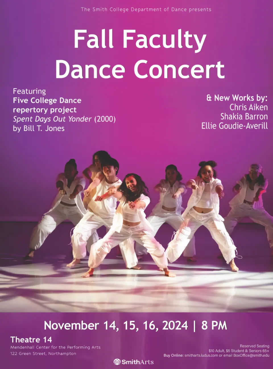 The Fall Faculty Dance Concert will be held in Theatre 14, Mendenhall Center for the Performing Arts, 122 Green Street in Northampton. Tickets are reserved seating, $5 for students and 65+, and $10 for adults. Tickets can be purchased online at https://smitharts.ludus.com or by emailing BoxOffice@smith.edu.