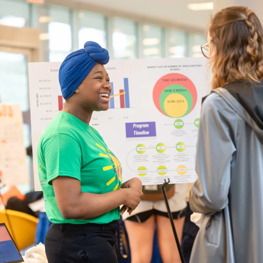 On April 12, the Julia McWilliams Child ’34 Campus Center was buzzing with creativity, inspiration, a touch of genius, and a whole lot of joy. Smith students stepped up to participate in the first-ever Co-Innovate for Change Challenge, sponsored by the Jill Ker Conway Innovation and Entrepreneurship Center. Student teams presented project proposals—in various phases of development—that solved real-world issues with inventive solutions. Joy was the theme for this year’s challenge, which turned into a full day of celebration and sharing ideas for social change. From the start, the event was one big JOYpalooza, as organizers dubbed the day.
