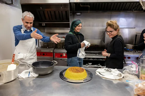 From left, Professor Suleiman Ali Mourad, Rinal Dahhan ’27, and Professor Mahnaz Mahdavi prepare tahdig, a Persian rice dish, in class.