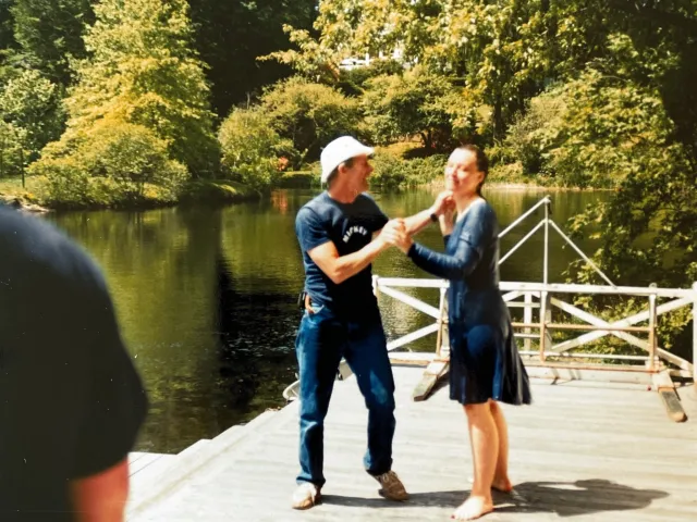 Micky Finn and Aimie Smith Chapple ’91 dancing on the dock of Smith's boathouse. Courtesy of Aimie Smith Chapple ’91